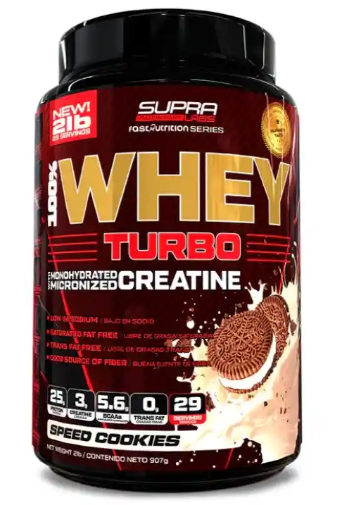 FAST NUTRITION – 100% WHEY TURBO WITH CREATINE 25g de proteína. 5.6g de Aminoácidos ramificados (BCAAs). 0g Grasas Trans. 3g de creatina monohidratada ENDULZADO CON ESTEVIA LIBRE DE GLUTEN BAJO EN SODIO LIBRE DE GRASA SATURADA BUENA FUENTE DE FIBRA AMIGABLE CON DIETAS KETO BOVINO ALIMENTADO CON PASTO LIBRE DE HORMONAS LIBRE DE GMO LIBRE DE PESTICIDAS