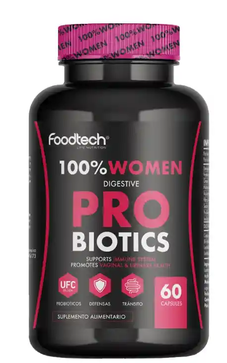 El 100% Women Digestive Probiotics de Foodtech es un suplemento alimenticio en cápsulas que contiene una mezcla de 10 cepas probióticas específicas para cumplir con los requerimientos del cuerpo de las mujeres.