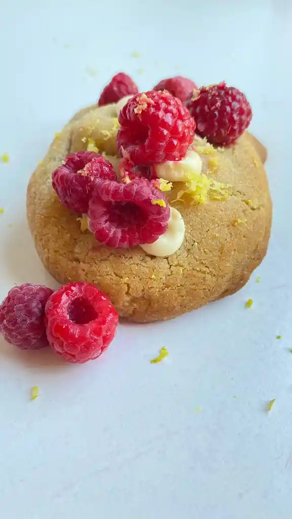 Cookies rellenas de cheescake con frambuesas frescas y ralladura de Limón