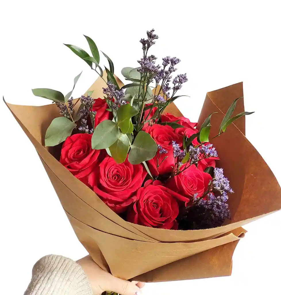 12 rosas rojas con follaje envueltas en papel kraft. Rosas de color Rojo ideal para el Amor