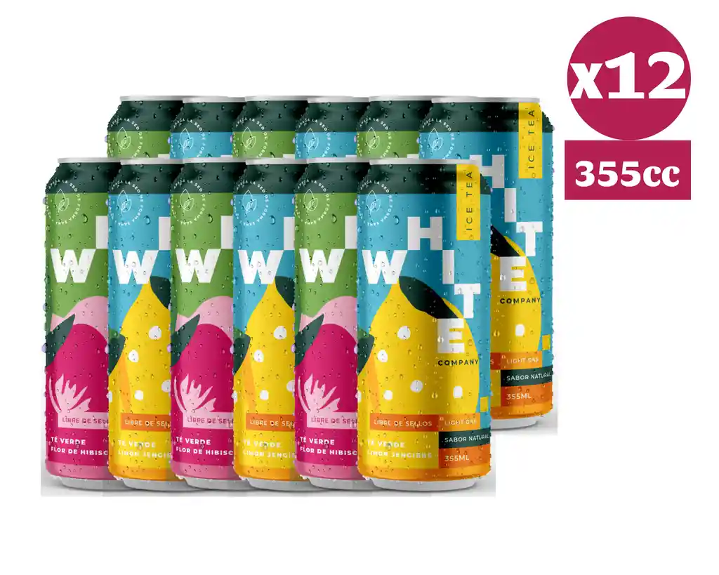 PACK MIX 12x ICE TEA TE VERDE FLOR DE HIBISCUS (FLOR DE JAMAICA) - LIMÓN JENGIBRE WHITE COMPANY LATA - 6 x Ice Tea Te Verde Flor De Hibiscus White Company Lata 355cc - 6 x Ice Tea Te Verde Limón Jengibre White Company Lata 355cc White Iced Tea es una bebida funcional en base a Té Verde, levemente gasificada, sin edulcorantes, sin sellos y endulzada naturalmente, que tiene una presentación en formato Slim Can 355 cc, y que en esta primera etapa tiene 2 refrescantes sabores: Té Verde Limón Jengibre y Té Verde Flor de Hibiscus. Queremos ser una alternativa sana y natural para apagar la sed, y que haga "match" con un estilo de vida contemporáneo y que pueda ser consumida por todo el mundo. En un país donde consumimos mucho té, y también muchas gaseosas, White Iced Tea llegó para ser la solución que (de cierta forma) es capaz de combinar ambos mundos. Disfruta de una refrescante combinación de sabores con el Ice Tea Te Verde Flor de Hibiscus (Flor de Jamaica) y Limón Jengibre de White Company. Con un delicioso sabor a té verde y flor de hibiscus ó Limón Jengibre, esta bebida es perfecta para aquellos que buscan una opción light y libre de gluten. Además, su bajo contenido de sodio la convierte en una alternativa saludable. Presentado en un práctico envase de lata de 355 cc, este Ice Tea es ideal para llevar contigo a donde quieras. Además, su agua gasificada le da un toque especial que te hará disfrutar cada sorbo. Atrévete a probar esta deliciosa bebida y descubre una nueva forma de refrescarte con White Company.