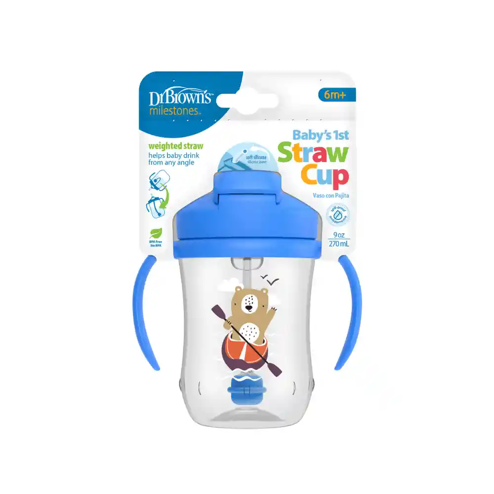 Si tu hijo está comenzando a tomar líquidos, este vaso con asas y pajita es perfecto para ese proceso. Pueden usarlo niños a partir de los 6 meses en adelante. Por su sistema, el vaso Dr. Browns pone en práctica al bebé para pasar de inclinar el vaso boca abajo a beber en forma vertical. Su capacidad es de 270 ml. Cualidades: Todas las piezas son extraíbles para limpiar. Es antiderrames Es apto para el lavavajillas Sin BPA