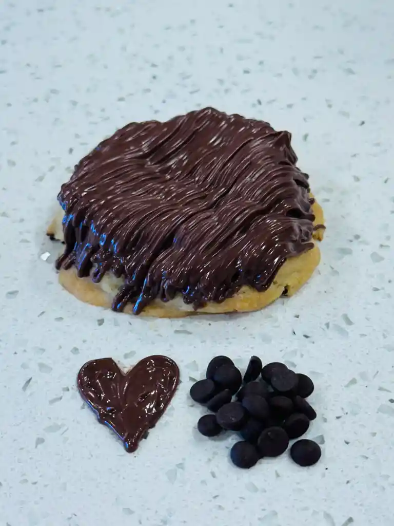 Caja de 3 galletas de suave textura hecha con chips de chocolate y toppings de nutella al estilo New york Cookies, 50 a 55 grs. cada galleta aprox.