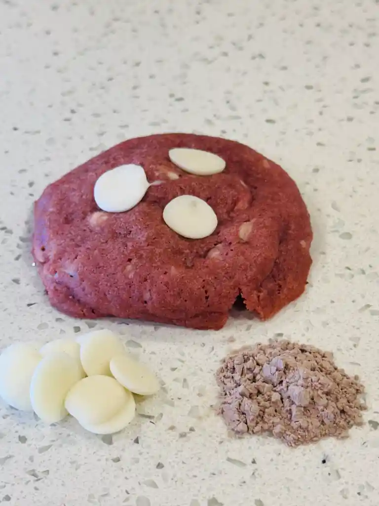 Galletas suave textura de cacao, con cremoso relleno de vainilla y toppings de chocolate blanco al estilo New York Cookies, 50 a 55 grs. cada galleta Caja con 3 galletas Red velvet