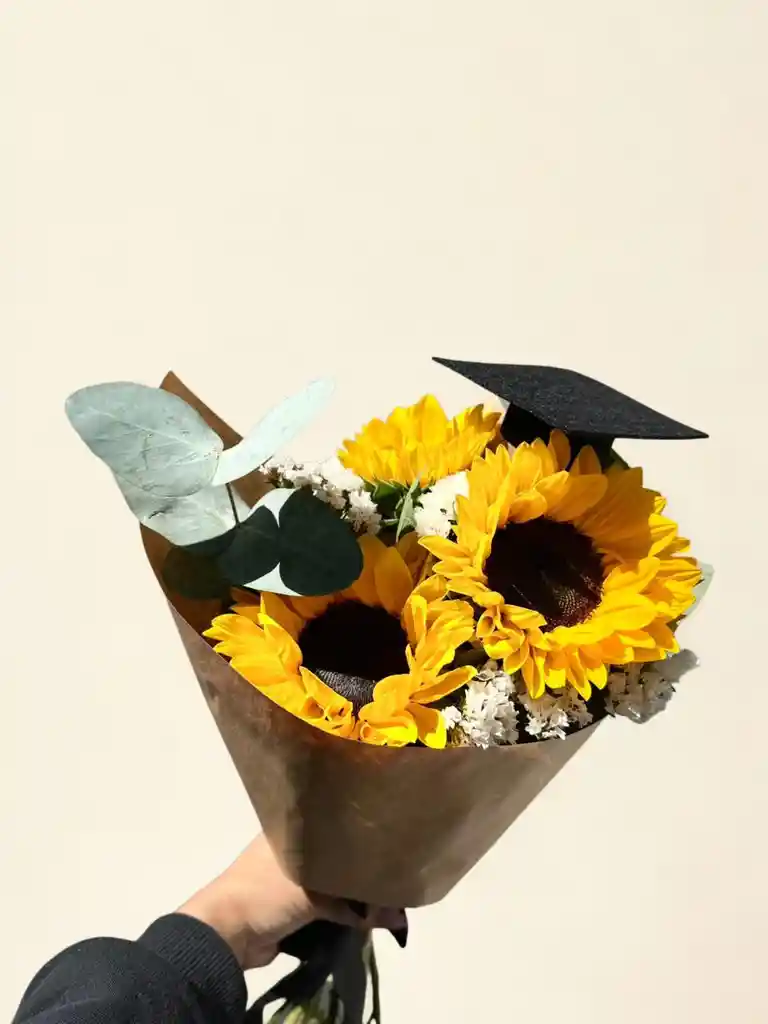 LINDO RAMO DE 3 GIRASOLES CON FOLLAJE DEL DÍA MAS BIRRETE DE GRADUACIÓN
