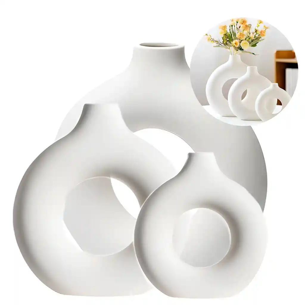3 Jarrones de cerámica Blanca Forma de Embrión para Plantas Tamaños Variados Dale un toque único a tus espacios con este jarrón de porcelana con diseño circular y hueco, una pieza moderna y elegante que realza cualquier rincón del hogar. Su estilo limpio y su tono marfil aportan un aire contemporáneo, perfecto como centro de mesa o como detalle decorativo en tu sala, dormitorio u oficina. Ideal para combinar con flores secas, pasto de pampas, ramas naturales o simplemente solo, este jarrón se convierte en un reflejo de tu buen gusto y estilo de vida. Fabricado con porcelana fina moldeada artesanalmente, este jarrón con forma de dona ha sido cocido a alta temperatura, lo que garantiza resistencia y durabilidad. Su superficie presenta un acabado blanco esmerilado mate, suave al tacto y con una textura elegante que destaca sin necesidad de esfuerzo. Diseño redondo y hueco tipo rosquilla, ideal para distintos estilos decorativos. Compatible con flores naturales, artificiales o pampas decorativas. Base estable y lisa, con un delicado acabado mate dorado. Perfecto para usar de manera individual como pieza decorativa o junto a otros adornos. Este jarrón combina con ambientes modernos, rústicos, escandinavos o clásicos, siendo un complemento versátil para tu hogar. Úsalo en el comedor, estante, mesa de centro, repisa o escritorio, y transforma cualquier espacio en un ambiente más acogedor y estiloso. Además, es una excelente opción de regalo para una amiga, mamá o colega amante de la decoración — un detalle elegante que nunca pasa desapercibido. Especificaciones: Material: Porcelana: Dimensiones: - 23.4 X 22.2 X 2.8CM - 19.8 X 18 X 2.5 CM - 14.5 X 13.3 CM Color: Blanco Uso: Poner plantas Contenido de paquete: 3 Jarrones Blancos