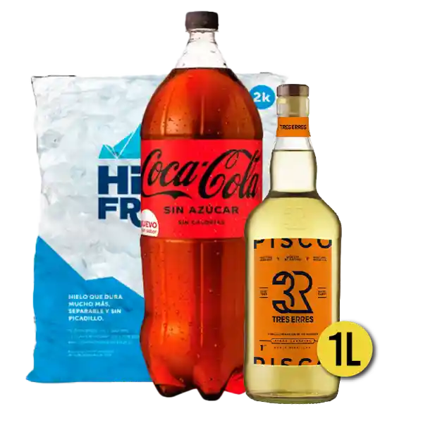 Contiene 3 Unidades. 3R Pisco 1 L + Coca-Cola Gaseosa 1.5 L + Hielo 2 Kg.
