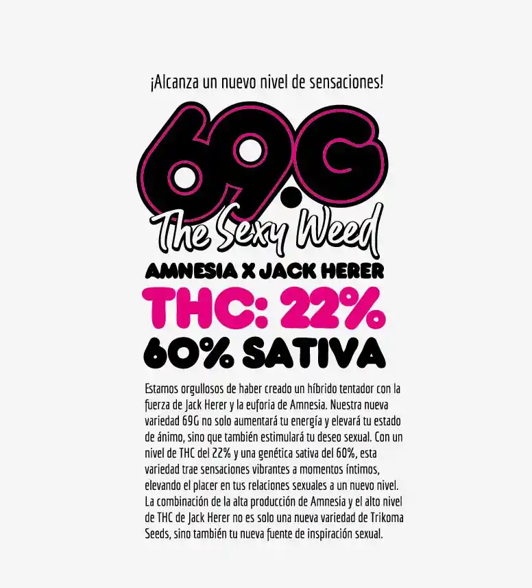 Alcanza un nuevo nivel de sensaciones! Estamos orgullosos de haber creado un híbrido tentador con la fuerza de Jack Herer y la euforia de Amnesia. Nuestra nueva variedad 69G no solo aumentará tu energía y elevará tu estado de ánimo, sino que también estimulará tu deseo sexual. Con un nivel de THC del 22% y una genética s4tiva del 60%, esta variedad trae sensaciones vibrantes a momentos íntimos, elevando el placer en tus relaciones sexu4les a un nuevo nivel. La combinación de la alta producción de Amnesia y el alto nivel de T H C de Jack Herer no es solo una nueva variedad de Trikoma Seeds, sino también tu nueva fuente de inspiración sexu4l. CARACTERISTICAS: Genética: Amnesia x Jack Herer Tipo: Sativa 60% -//- Indica 40% Producción en interior: 550 gr./m2 (con luz de 600W) Producción en exterior: 1 – 1,5 Kg /planta Floración en interior: 70 días Floración en exterior: 2/4 octubre Floración en Sudamérica: 2/4 abril