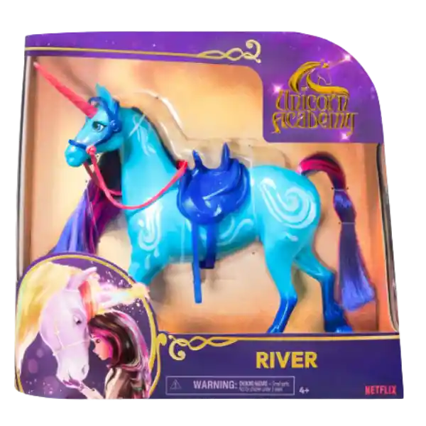 Lindo unicornio de Unicorn Academy, que representa al unicornio azul River, conocido por la serie "Unicorn Academy". El unicornio de Unicorn Academy es gentil, tímido y temeroso de su propio ala. Aunque puede hacer tonterías, siempre puedes confiar en él cuando realmente importa. Su habilidad mágica es el agua. Puede crear agua con sus pezuñas y controlar el agua con el cuerno de su frente. Mide aproximadamente 28 cm de alto. Se incluyen una silla de montar y un arnés, que se pueden quitar y poner, y tanto la crin como la cola se pueden cepillar. Se recomienda de 4 años en adelante.