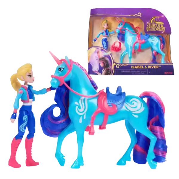 El set de juego ofrece un jinete de unicornio detallado de aprox. 11 cm de alto, así como un unicornio con sillín y riendas extraíbles que dan vida a las emocionantes aventuras de la popular serie de Netflix. La muñeca tiene 7 articulaciones para que pueda adoptar poses de acción realistas y montar en su unicornio. El unicornio se puede quitar para un juego de rol realista. El unicornio tiene una melena y una cola largas y sedosas que se pueden peinar, trenzar y decorar con el cepillo incluido. Contiene 1 muñeca de aprox. 11 cm, 1 unicornio de aprox. 12 cm con sillín y riendas extraíbles, 1 cepillo para el pelo. Los jinetes y sets de unicornio de Unicorn Academy no solo deleitan a los fanáticos de la serie de Netflix. También son el regalo ideal para todos los amantes de los caballos y los unicornios a partir de 4 años que quieran sumergirse en historias imaginativas. Se recomienda de 4 años en adelante.