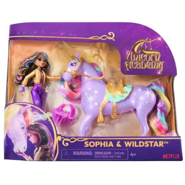 Construye tu propio mundo de Academia Unicornio junto a Sofia y su inseparable unicornio Estrella Disfruta recreando las emocionantes escenas de la popular serie de tv y sumérgete en aventuras llenas de fantasía y diversion. La muñeca Sophia mide 11,5 cm y el unicornio 13 cm de alto. Con la ropa auténtica que lleva en la serie y 7 puntos de articulación, Sophia cobra vida como nunca antes. Monta a Sophia sobre Wildstar y cabalga hacia emocionantes aventuras. ¡El regalo perfecto para las pequeñas amantes de los unicornios para niñas. Equipa a Wildstar con la montura extraíble y la brida como en la serie, y usa el cepillo para mantener suave y reluciente la cola de arcoíris ¡mantén a tu unicornio siempre listo para la próxima aventura. El pack muñeca Sophia + unicornio Wildstar (unicornio Estrella) está diseñado para niños y niñas a partir de 4 años. Fácil de manejar, e igualitos a tus personajes de Unicorn Academy este pack de figuras garantiza horas de diversión. Incluye 1 muñeca articulada Sophia, 1 unicornio Wildstar 'Estrella', 1 montura extraíble, 1 brida extraíble, 1 cepillo para Wildstar
