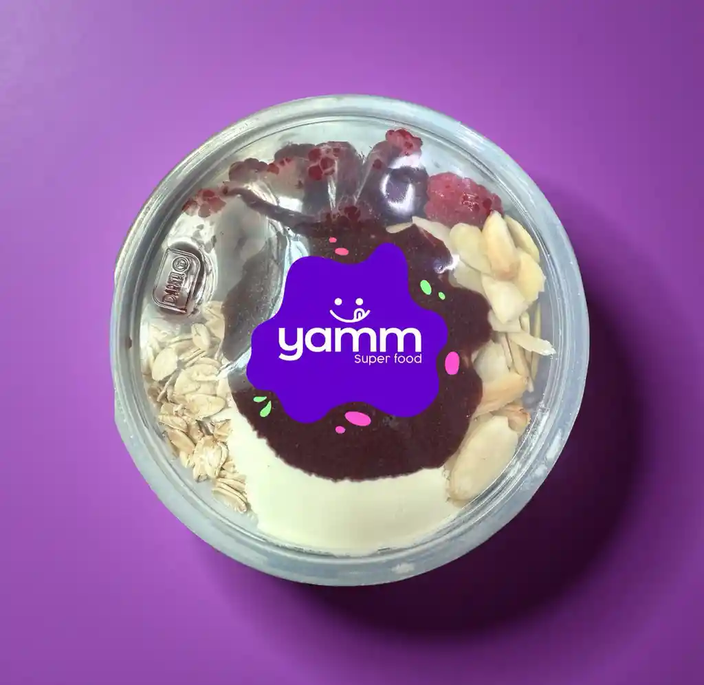 base: Sorbete de Acai agregado: leche condensada, leche en polvo, avena integral, frambuesa, almendra laminada Producto congelado. Espera 15 a 20 min a temperatura ambiente y disfruta de tu autentico Yamm Acai bowl