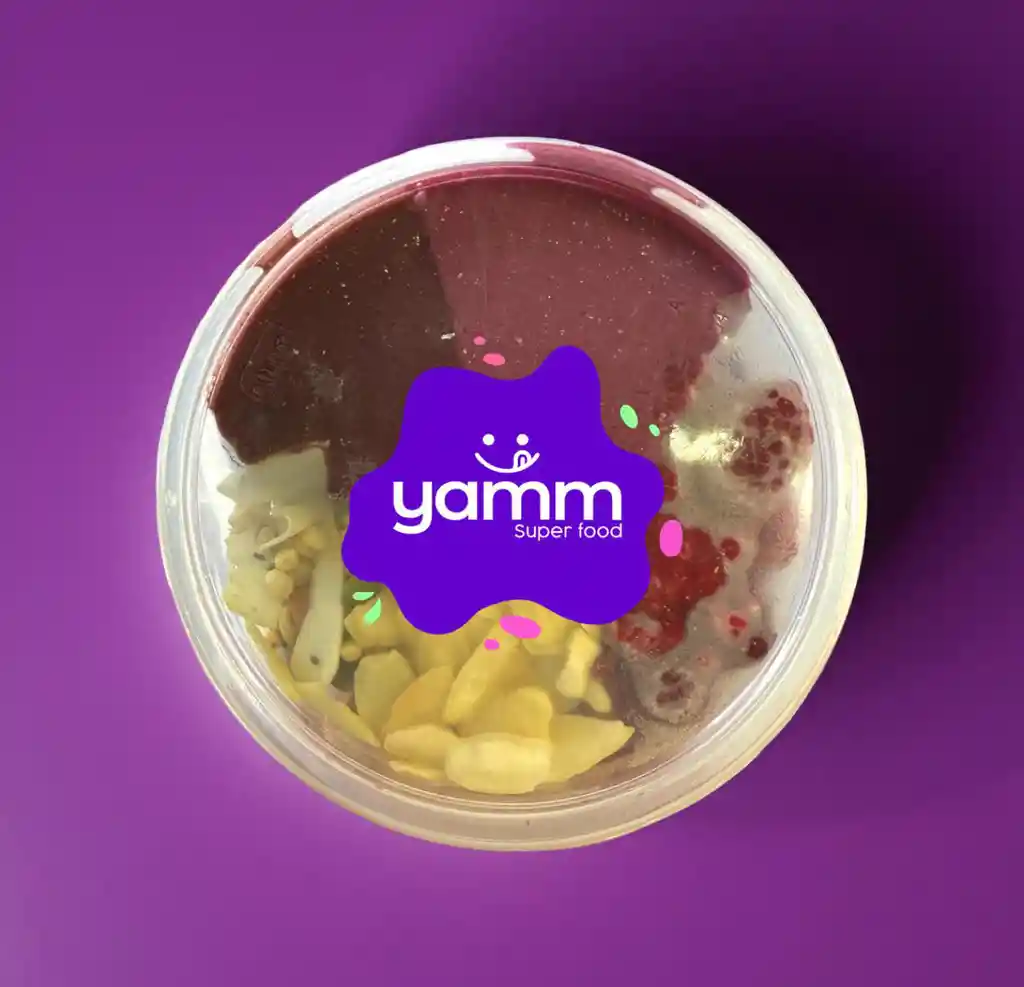 Acai / Maqui base: Sorbete de Acai, Sorbete de Maqui agregados: Granola premium Yamm, almendra laminada, frambuesa Producto congelado. Espera 15 a 20 min a temperatura ambiente y disfruta de tu autentico Yamm Acai bowl.