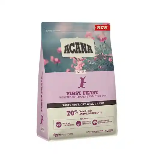 Acana First Feast 1,8 kgs es un alimento super premium para gatitos de hasta 1 año que contiene un 70% de pollo de corral, no enjaulados, y arenque entero. Acana First Feast ayudará a que tu gatito desarrolle una piel y pelaje saludable por sus niveles equilibrados de ácidos omega, crecimiento de músculos y huesos gracias a proteína de alta calidad que favorece el buen desarrollo. Además, la la taurina, EPA y DHA apoyan el crecimiento y desarrollo de una función cognitiva y visión saludable, todo en un alimento sabrosamente rico. Además, todos sus ingredientes son aptos para el consumo humano previo a su inclusión en sus alimentos. El resultado es una comida para gatos rica en proteínas, nutritiva y deliciosa que les ayuda a vivir una vida sana y feliz. El 50% de los ingredientes son frescos, es decir nunca congelados, así que la refrigeración es la única manera en la que se preservan sus carnes frescas, mientras que las carnes crudas son ultra congeladas de inmediato para conservar toda su calidad. La otra mitad de los ingredientes de carne es seca o con aceites, ofreciendo una fuente natural de rica y nutritiva proteína y grasa animal. Acana se preocupa que sus ingredientes premium provengan de un grupo selecto de agricultores, ganaderos y pescadores que conocen y en los que han confiado durante décadas. Características Alimento para gatos Para gatitos de hasta 1 año Calidad super premium Con proteína de pollo y arenque Sin ingredientes de relleno Tamaño 1,8 kilogramos
