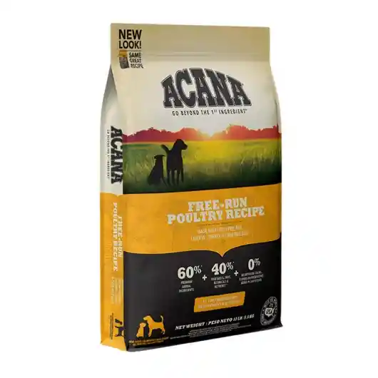 Acana Perro Free-Run Poultry contiene un 60% de aves de corral -más del doble que la mayoría de los alimentos especializados para perros. La mitad de aves de corral son FRESCAS, aportando nutrientes esenciales en su forma más nutritiva y la otras son secas, lo cual ofrece una fuente natural de proteína.Ofrece tres carnes frescas en proporciones de PresaEntera, las cuales incluyen carne, órganos y cartílago que aportan nutrientes de una manera completamente natural. Pollo de corral: carne, menudillos y cartílago frescos de granjas locales. Pavo Tom de corral: carne, menudillos y cartílagos frescos de granjas de Kentucky locales. Huevos del nido: enteros y frescos de las granjas locales de Kentucky.