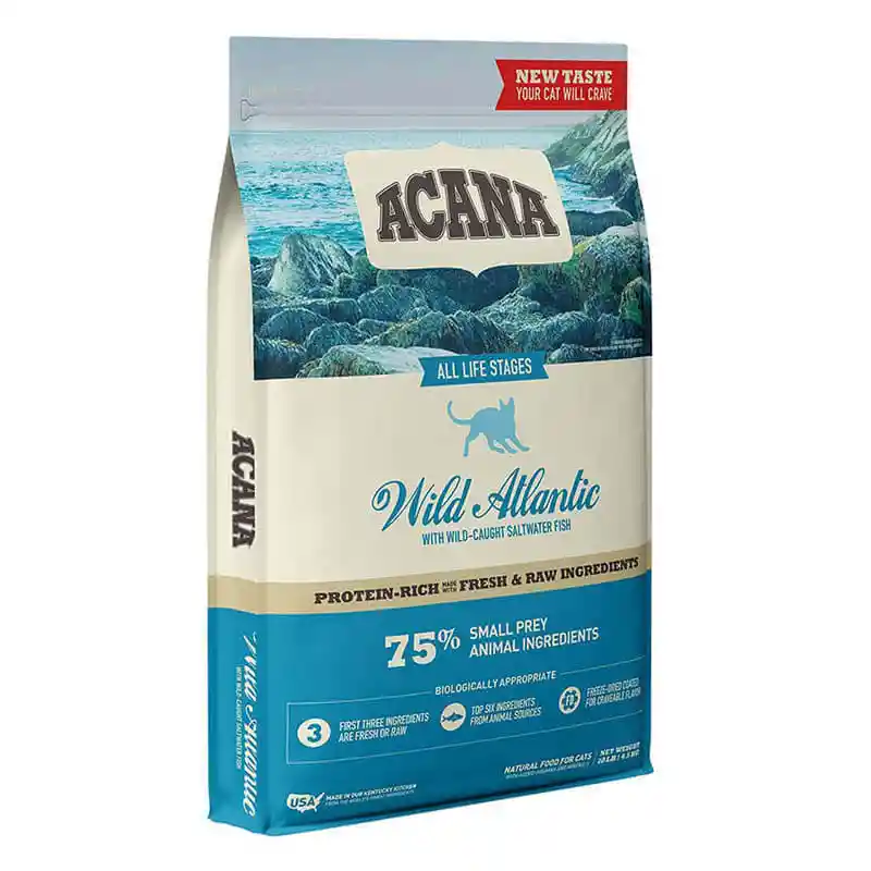 Acana Wild Atlantic Cat es una comida para gatos elaborada con un 75% de pescados frescos que provienen de las frías aguas atlánticas de Nueva Inglaterra que son reconocidas por su diversidad sostenible de peces salvajes y un 25% de vegetales