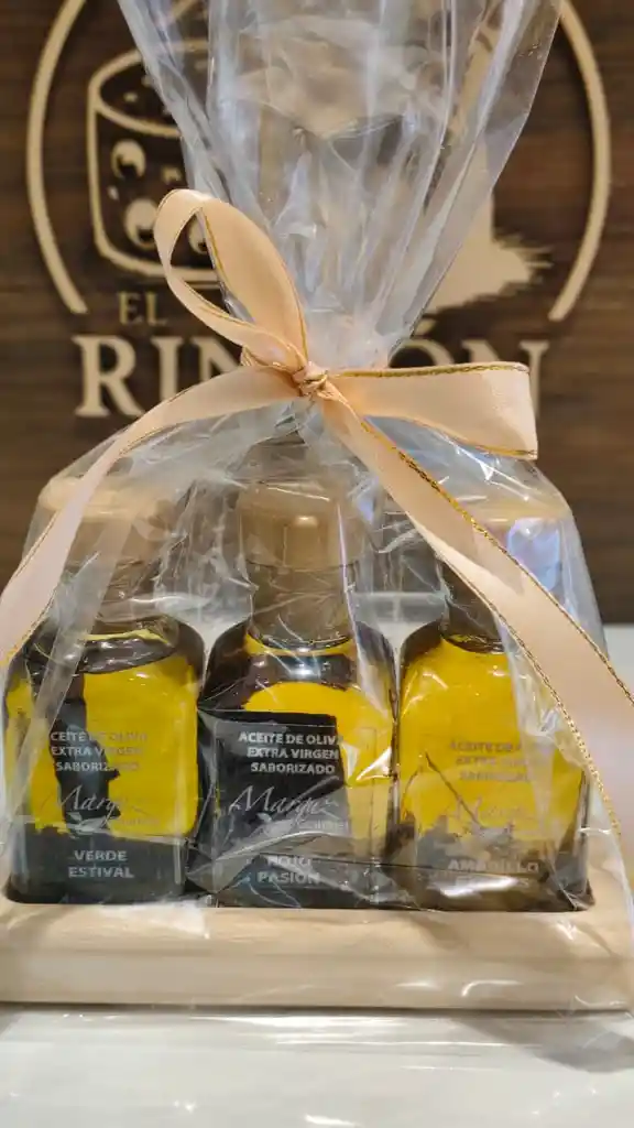 Mini Aceites de Oliva de 50 gr sobre una linda base de madera. Los Aceites saborizados son (Aceite con ají cacho de cabra, Aceite con Ajo y Tomillo Aceite con Oregano y Albahaca)