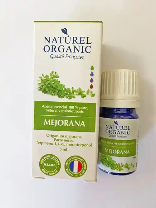 El aceite esencial Mejorana es excelente para tratar estrés, ansiedad. Nombre científico: Origanum majorana. País de origen: Egipto. Método de extracción: Destilación completa al vapor de agua a baja presión. Componentes bioquímicos principales: Terpineno 1,4-ol, monoterpenol Aroma: dulce, fino.