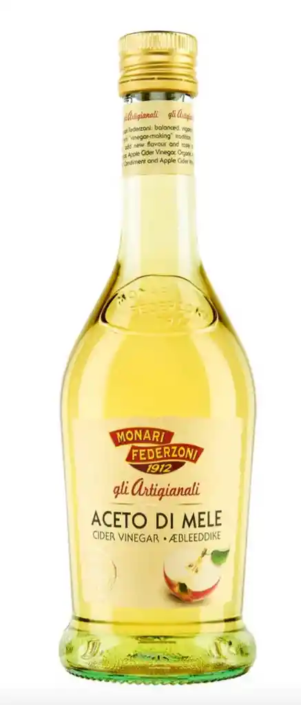 Vinagre de Sidra de Manzana ml.500 Monari Federzoni DESCRIPCIÓN Vinagre de sidra de manzana elaborado con manzanas 100% italianas. Fabricado en Italia a partir de manzanas italianas enteras y sin pasteurizar. Excelente condimento con un sabor delicado para cualquier plato de verduras pero también para usar durante la cocción. Características principales Envase Botella de vidrio Contenido de 500 ml. Listo para utilizarlo en comidas. Almacenar en lugar fresco y seco.