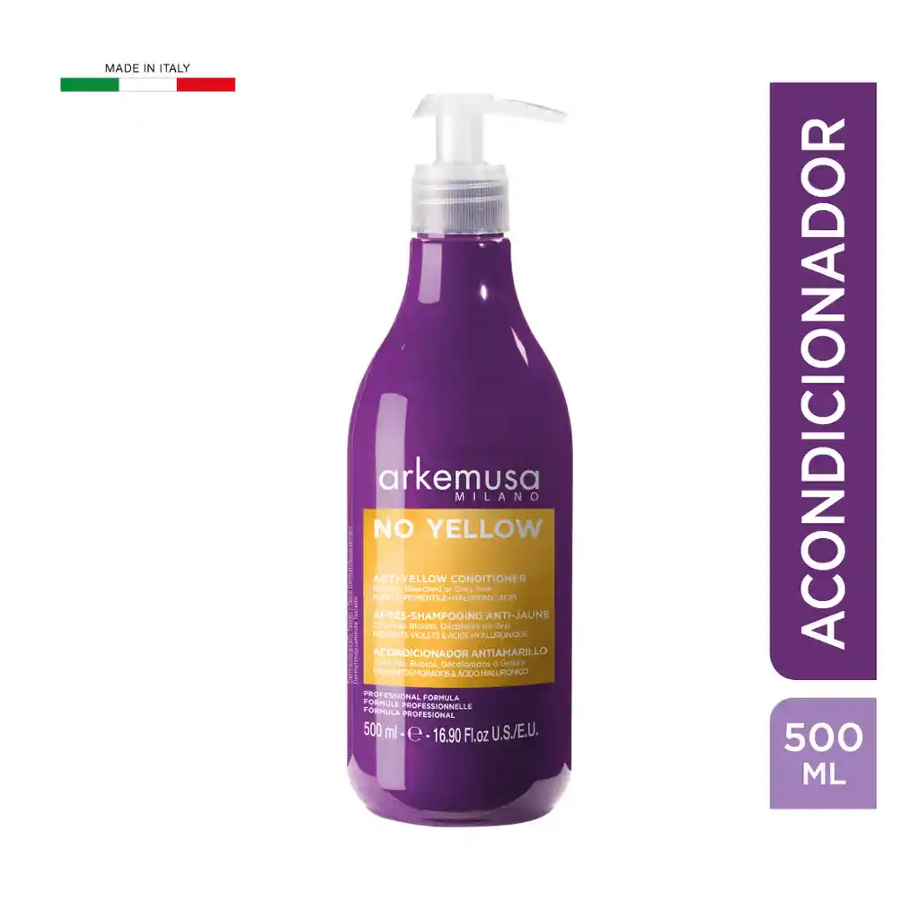 Acondicionador ARKEMUSA anti amarillo formulado con activos que ayudan a neutralizar tonos amarillos no deseados