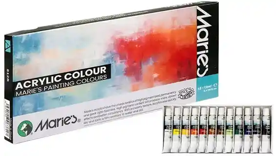 Set de 12 colores de acrílicos en tubos de 12 ml.Colores: Blanco Titaniun, Amarillo limón, amarillo oro, Rojo vermillon, rojo navidad, café siena, café oscuro, verde esmeralda, verde oscuro, azul marino, azul oscuro, negro.Uso en: para la mayoría de superficies, como vidrio, madera, lona, barnizables decoración, de plástico, espuma, Cerámica decorativa, papel pintado, terracota, caballete de pizarrón, pizarra de gis, arte de papel.