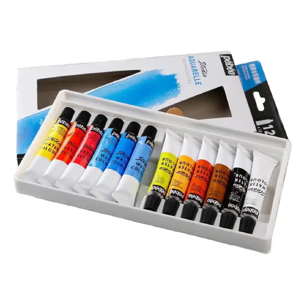 Los colores de las acuarelas de Pebeo son fáciles de diluir con una profundidad de tono y transparencia que no desaparecen después de secos. Los colores se han seleccionado cuidadosamente para responder a las exigencias del acuarelista aficionado. Se secan en cuestión de horas, dependiendo del soporte y la cantidad de agua utilizada. Los pinceles se lavan sólo con agua. Características: Contiene 12 colores en tubos de 12 ml Pintura de acuarela de buena calidad con colores brillantes y transparentes. El tono profundo de los colores permanece incluso una vez seco Los colores son fáciles de diluir con agua Seca en unas pocas docenas de minutos, según la dilución y el peso del papel. El juego contiene los siguientes colores: amarillo limón primario, rojo cadmio primario, carmesí de alizarina, azul ftalo primario, azul cobalto, azul de prusia, verde vejiga, ocre amarillo, siena tostada, sombra tostada, negro marfil y blanco de china