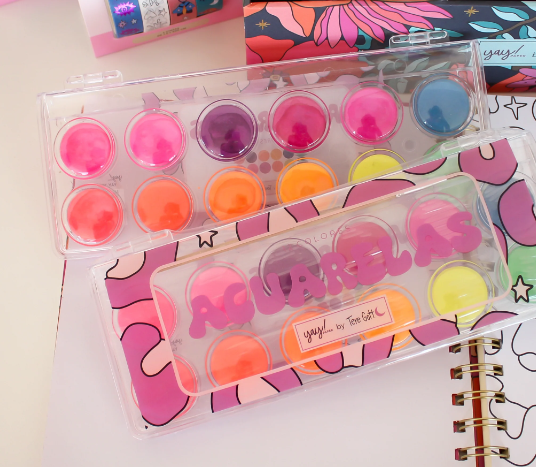 Set de 12 acuarelas con colores vibrantes y neones ideales para darle un toque especial a tus creaciones. Además su tapa te puede servir como paleta para mezclar y diluir los colores!!