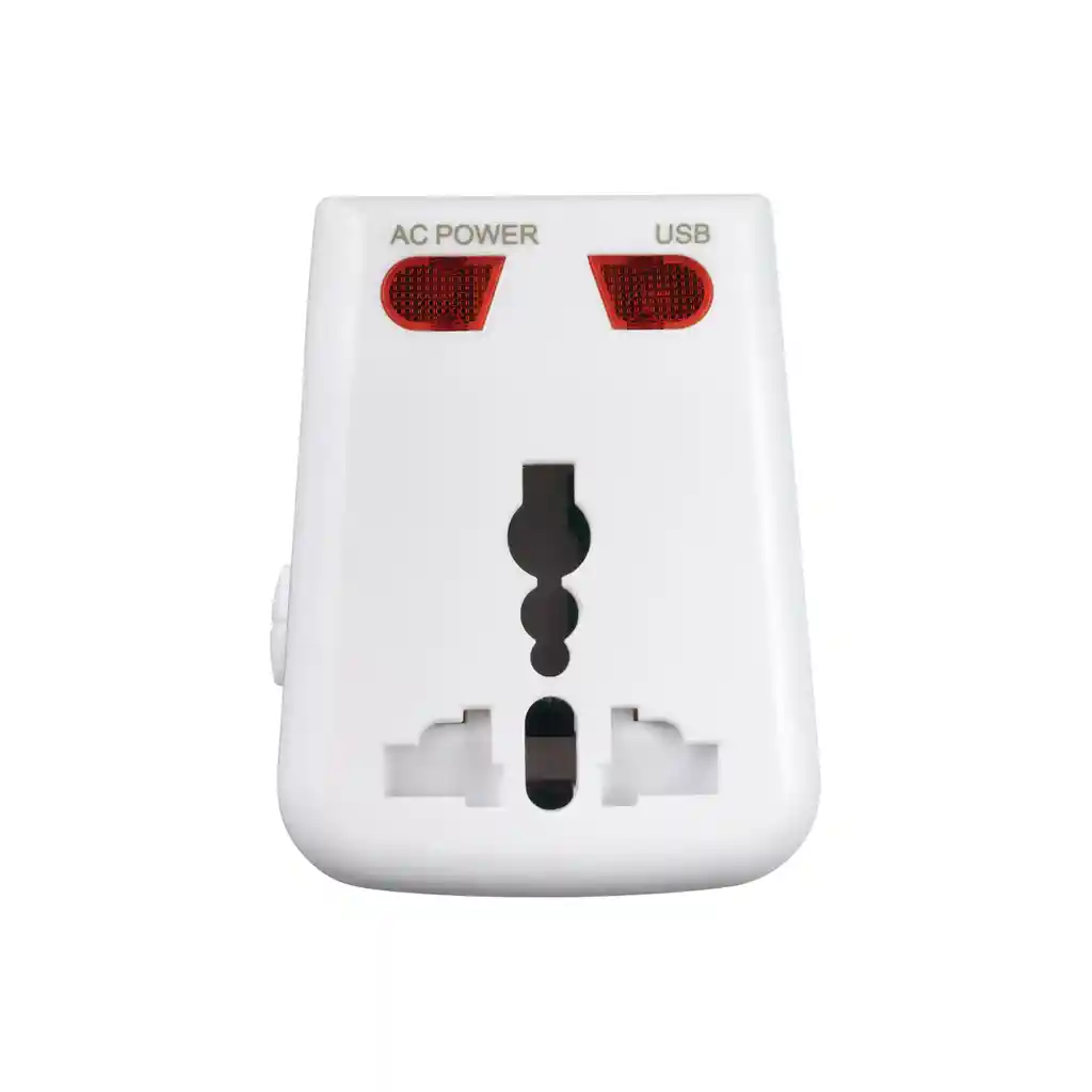 Deja tus cargadores en la casa! Este adaptador universal con USB conecta a los viajeros en más de 150 países del mundo y trae puerto USB individual para cargar teléfonos, tablets y otros dispositivos digitales! Sirve para usar con los enchufes más comunes de 2 y 3 pines para conectarte a la corriente de más de 150 países. Cuenta con 4 juegos de pines que se pueden intercambiar rápida y fácilmente entre las configuraciones americanas, australianas, británicas y europeas. Este adaptador de corriente conecta y carga simultáneamente. Este adaptador es perfecto para usar con equipos electrónicos pequeños hasta 6A/110V-250V. No usar con secadores de pelo. No convierte el voltaje. Compruebe que el voltaje de su aparato electrónico es compatible con el del enchufe extranjero. Contiene 1 Puerto USB-A. Fusible reemplazable. Clasificación Eléctrica: 110-220v / 690-1300w (6 amps). Material: Eléctrico, Plástico. Medidas del Producto (cms): 4,7 x 6,2 x 7,1 Peso: 85 grs. VER INSTRUCCIONES DE USO