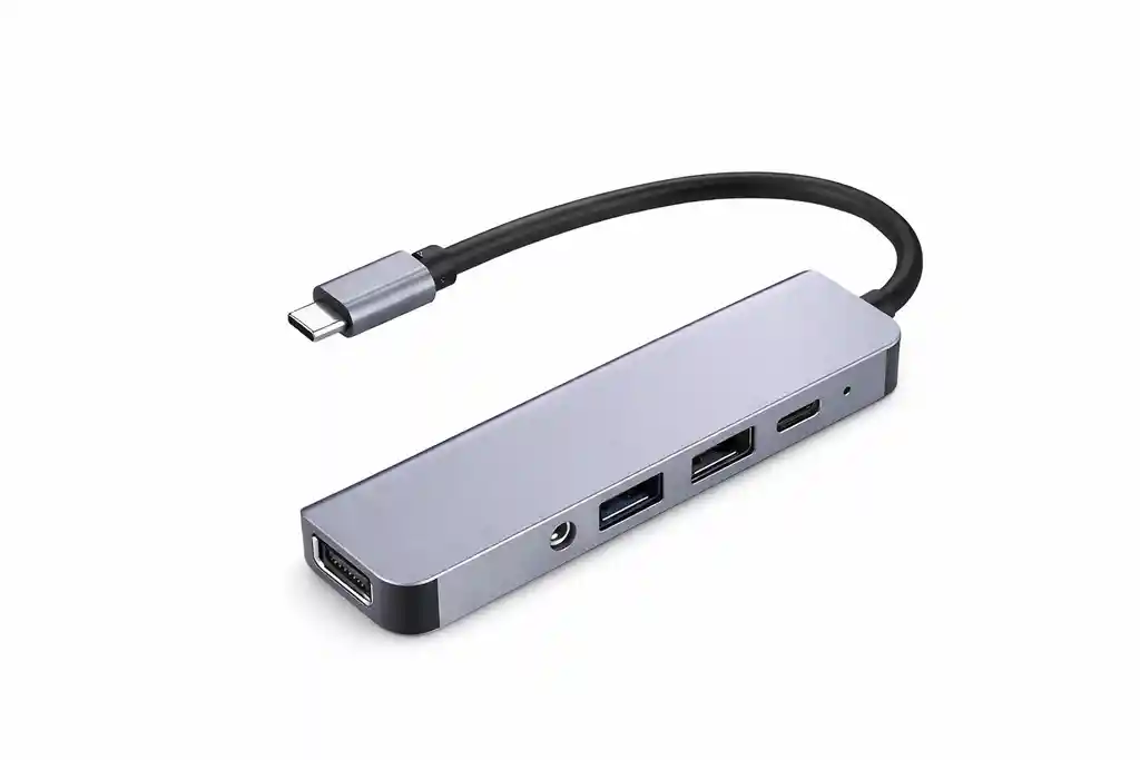 Adaptador multipuerto USB-C con salida HDMI 4K, puertos USB 3.0, carga PD y audio. Ideal para conectar pantalla, periféricos y cargar el dispositivo al mismo tiempo. Compacto y portátil.