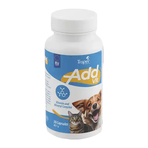 ADD VIT es un suplemento nutricional especialmente formulado para perros y gatos, que proporciona un equilibrio perfecto de vitaminas, minerales, antioxidantes y compuestos que refuerzan el sistema inmunológico. Este producto está diseñado para complementar la dieta diaria de tu mascota, favoreciendo su bienestar general, el desarrollo adecuado, y el mantenimiento de una buena salud. BENEFICIOS • Desarrollo y crecimiento óptimos: Asegura que los cachorros y gatitos obtengan los nutrientes necesarios para su desarrollo adecuado. • Apoyo durante la convalecencia: Favorece la recuperación rápida y eficaz de los animales después de enfermedades o cirugías. • Refuerzo del sistema inmunológico: Gracias al betaglucano y las algas pardas, ADD VIT estimula las defensas naturales del cuerpo, protegiendo a las mascotas frente a enfermedades. • Bienestar general: Su mezcla de vitaminas, minerales y antioxidantes contribuye al bienestar general, mejorando la energía, la vitalidad y la salud de la piel y pelaje. • Salud articular y muscular: Los ácidos grasos Omega-3 ayudan a mantener la salud de las articulaciones y los músculos, especialmente en animales activos o mayores. CONTIENE: Frasco de 30 cápsulas, con polvo altamente palatable que puede mezclase previamente con alimento.