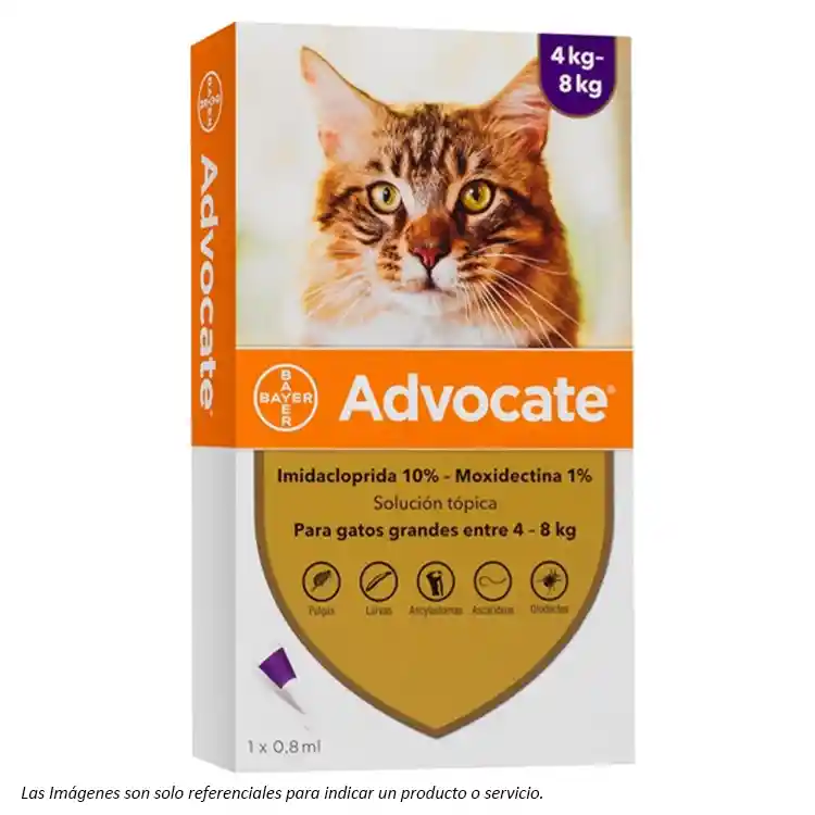 Elanco Advocate es un Antiparasitario Interno y Externo en Pipeta para Gatos que pesan de 4 a 8Kg. Es usado para el tratamiento y control de: *Infestación por pulgas Ctenocephalides spp. *Infestación por el ácaro del oído Otodectes cynotis. *Sarna Demodicosis causada por Demodex cati o Notoedres cati. *Infestación por el parásito del corazón Dirofilaria immitis. *Infestaciones por Nemátodos Gastrointestinales: Larva L3, Larva L4, adultos inmaduros y adultos de Toxocara canis, Ancylostoma caninum y Uncinaria stenocephala y adultos de Toxascaris leonina y Trichuris vulpis. La pipeta se aplica en el lomo de tu gato una vez y su efecto protector dura hasta 4 semanas.