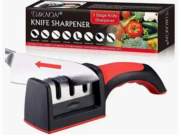 Afilador de Cuchillos, revestimiento de goma antideslizante de color rojo suave para un agarre adicional, panel Decorativo de Acero Inoxidable.