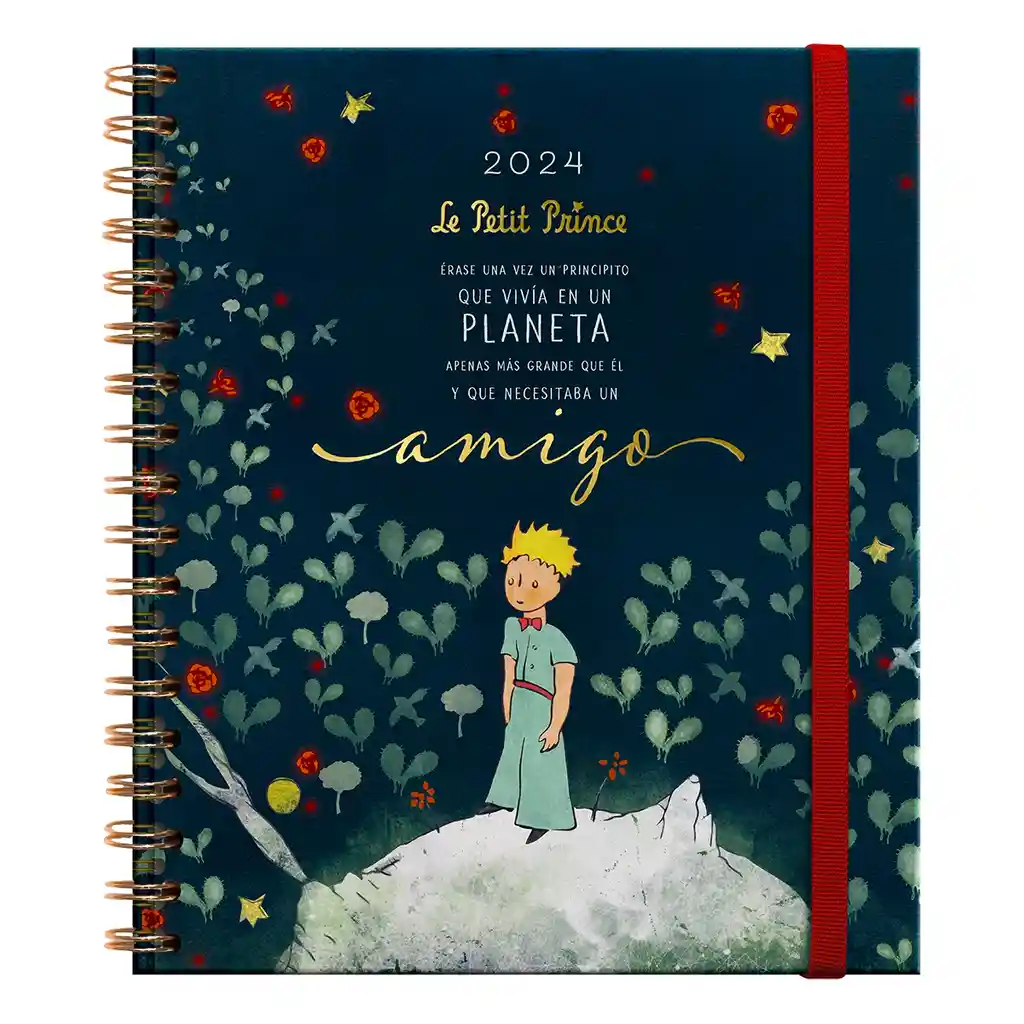 Semana a la vista Tamaño (cm) 17 x 20 Encuadernacion Espiral Paginas 160 Portada Papel laminado mate, con brillo sectorizado, relieve y folia Contenido Contiene datos identificacion, calendarios 2023, 2024 y 2025, directorio telefonico, hojas de notas y notitas prepicadas. Cierre con elastico, bolsillo con fuelle, forros interiores impresos, cinta marcadora y lamina de stickers y citas del libro el Principito Hojas Interiores Papel de bambu color crema de 100 gramos.