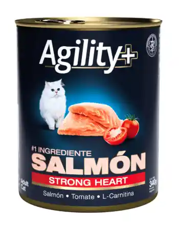 El bienestar de tu gato comienza desde adentro y se refleja en su vitalidad. Agility+ Lata Salmón Strong Heart es una nutrición de avanzada que supera los requerimientos nutricionales de los gatos adultos, combinando la excelencia de la proteína del salmón con ingredientes cuidadosamente seleccionados para potenciar su salud. Beneficios Nutrición avanzada: Fórmula de alta calidad que supera los requerimientos nutricionales del gato adulto. Proteína premium: Elaborado con carne de salmón, pollo e hígado porcino para una alimentación completa y balanceada. Protección cardíaca: Enriquecido con Taurina y L-Carnitina, esenciales para un corazón fuerte y saludable. Piel sana y radiante: Gracias a los ácidos grasos esenciales provenientes del salmón y aceite de pescado. Tracto urinario protegido: Ingredientes específicos ayudan a mantener la salud del sistema urinario. Sin sodio agregado: Opción segura y saludable para complementar con alimentos secos de Agility. Antioxidantes naturales: Extracto oleoso de alcaparra, salvia, té verde y romero para reforzar el sistema inmunológico. Rico en vitaminas y minerales: Incluye un balance óptimo de vitaminas A, D3, E, B y minerales esenciales para el bienestar general del gato. Textura y sabor irresistibles: Ideal para los paladares más exigentes y para mezclar con alimento seco. Ingredientes y Nutrición Carne de salmón, hígado porcino, carne de pollo, pulmón vacuno, aceite de pollo, aceite de pescado, fécula de mandioca, arroz, goma guar, fosfato monodicálcico, cloruro de potasio, concentrado de tomate deshidratado, bisulfato de sodio, l-lisina, dl-metionina, cloruro de colina, taurina, antioxidantes naturales (extracto oleoso de alcaparra, salvia, té verde y romero), l- carnitina, vitaminas (a, d3, e, b5, b3, b2, b1, k3, b6, b9, b12, b7), minerales (sulfato de zinc; sulfato ferroso; sulfato de manganeso; sulfato de cobre; iodato de calcio; selenito de sodio; selenio levadura). Análisis Garantizado Humedad (máx.) 78% Proteína bruta (mín.) 9% Extracto etéreo (mín.) 5% Fibra cruda (máx.) 2% Minerales (máx.) 3% Calcio (mín.) 0,2% Calcio (máx.) 0,4% Fósforo (mín.) 0,1% Fósforo (máx.) 0,3% Energía Metabolizable (Base seca): 3840 kcal/kg
