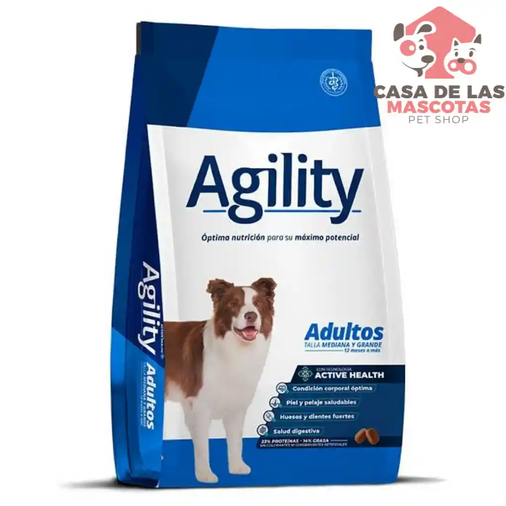 Agility Adultos Raza Mediana y Grande es un alimento completo y balanceado indicado para perros de 1 a 7 años. Los perros adultos necesitan una alimentación completa y equilibrada que cubra sus requerimientos nutricionales y les brinde salud y vitalidad. Agility Adultos es una fórmula exclusivamente diseñada con ingredientes de alta calidad, basada en su tecnología Healthy Complex: una óptima combinación de nutrientes minuciosamente establecidos para que tu perro mantenga siempre su máximo potencial.
