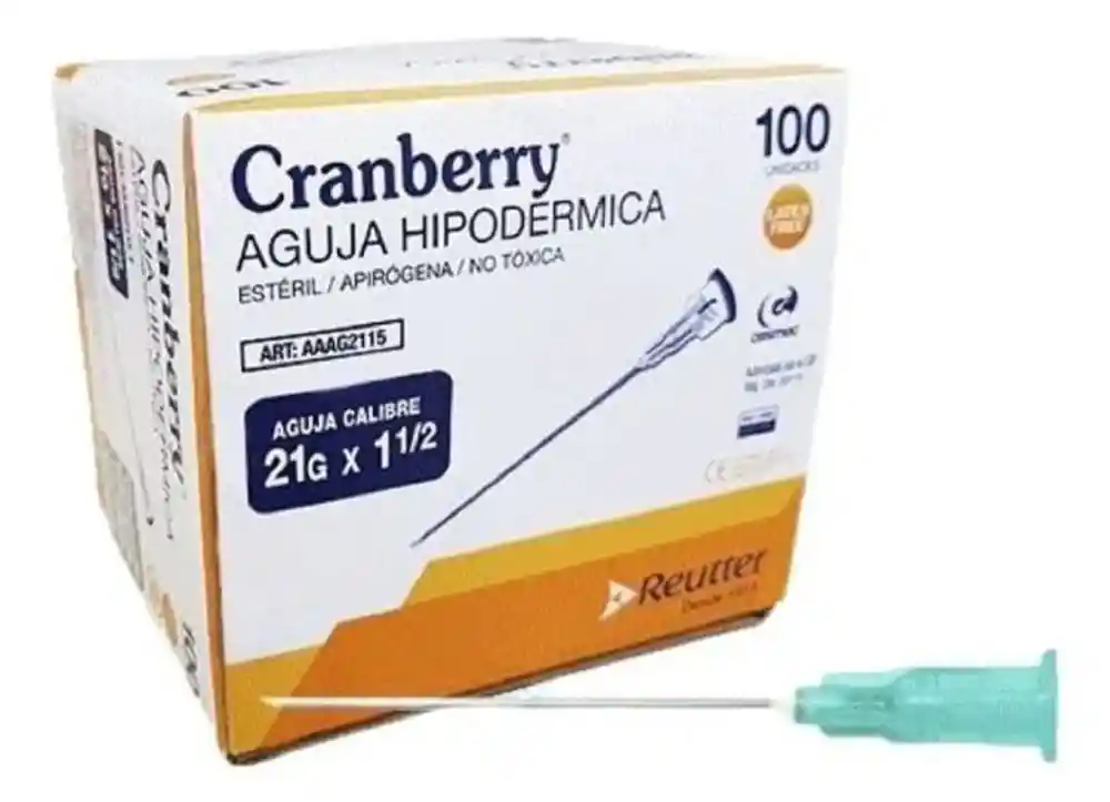 Insumo sanitario desechable formado por una aguja hueca con corte biselado y un pivote (conexión de aguja) de polipropileno que permite su inserción en una jeringa Luer Slip y/o Luer Lock.