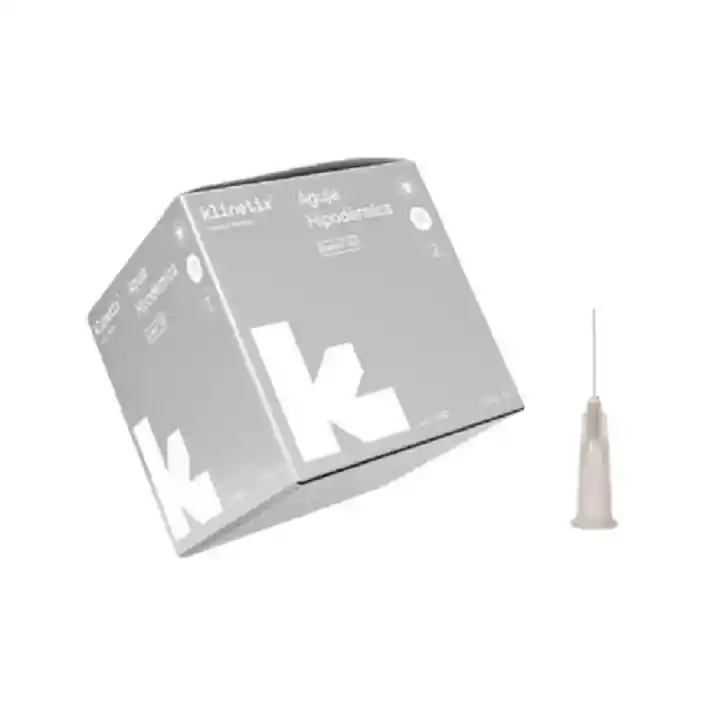 Agujas Hipodérmicas Klinetix: Precisión y Seguridad Estéril (Caja 100 un.) Las Agujas Hipodérmicas Klinetix son instrumentos de grado médico diseñados para garantizar una punción segura y eficiente. Fabricadas bajo estrictos estándares internacionales, estas agujas ofrecen una combinación perfecta de resistencia y delicadeza, siendo ideales para la administración de soluciones inyectables y la toma de muestras de fluidos en entornos hospitalarios, clínicos y domésticos. Bisel de Triple Corte para un Deslizamiento Suave La ingeniería de Klinetix se centra en la comodidad del paciente. Gracias a su bisel afilado de alta exactitud y su fabricación en acero inoxidable siliconado, la aguja penetra el tejido con una resistencia mínima. Esto se traduce en una reducción significativa del trauma tisular y el dolor, permitiendo un procedimiento mucho más fluido para el profesional y confortable para el paciente. Cada unidad es esterilizada con Óxido de Etileno (EO) y está 100% libre de látex, lo que elimina el riesgo de reacciones alérgicas y asegura la máxima asepsia en cada intervención. Conexión Universal y Variantes de Calibre Su pivote de polipropileno translúcido permite una identificación rápida del flujo y asegura un acople hermético y libre de fugas con jeringas Luer Slip y Luer Lock. 27G x 1/2”: Calibre extra fino, ideal para inyecciones intradérmicas y estética.