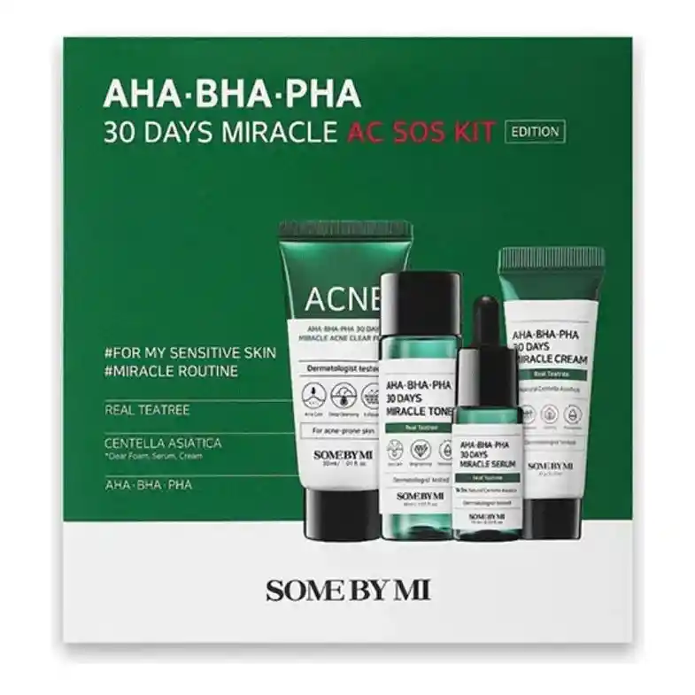 Un S.O.S para ese inesperado brote de acné, este kit de Somebymi ofrece una solución completa para esta situación. El limpiador acuoso controla el exceso de sebo y elimina las impurezas, mientras que el tóner de pH 5.5 con AHA/BHA/PHA y extracto de agua de árbol de té previene problemas y mantiene la piel saludable. El suero suavemente exfolia y elimina las impurezas de la piel, normalizando el período de rotación de la piel. Por último, la crema milagrosa elimina las células muertas de la piel y el sebo, a la vez que mantiene la piel hidratada. Todos los productos están libres de 20 ingredientes artificiales y han sido probados dermatológicamente para la piel sensible.Todos en tamaño mini, con fórmulas gentiles pero efectivas, podrás probar su efectividad en este formato. Limpiador facial AHA.BHA.PHA 30 Days Miracle 30ml. Limpiador facial para pieles con problemas de acné y piel grasa. Controla la producción de grasa sin irritar el cutis con su mezcla de AHA, BHA y PHA. Tónico AHA BHA PHA 30 Days Miracle 30 ml.Tónico hidratante y ligeramente exfoliante que equilibra el pH de su piel mientras se enfoca en los brotes y problemas de poros obstruidos. Sérum AHA BHA PHA 30 Days Miracle 10 ml.Serum calmante y relajante para el rostro, para pieles sensibles con problemas de acné. Crema facial AHA, BHA, PHA 30 Days Miracle 20 gr.Crema facial con problemas de acne, que fortalece la barrera de la piel, mientras trata y previene brotes de acné