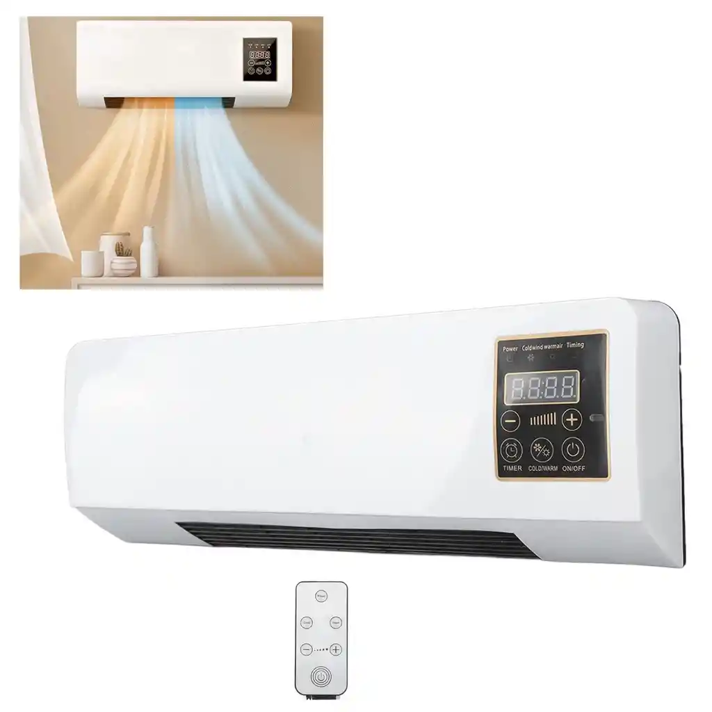 Aire acondicionado Frio/Caliente 2 En 1 Eléctrico para pared con Control Remoto. Función de calefacción y refrigeración 2 en 1: este calentador eléctrico y aire acondicionado cuenta con funciones de calefacción y refrigeración, y con 3 modos en ventilador, baja calefacción y alta calefacción, lo que lo convierte en una solución versátil para la comodidad durante todo el año. Diseño montado en la pared: el combo de calentador eléctrico y aire acondicionado está diseñado para una fácil instalación de montaje en pared, lo que le permite ahorrar espacio en el piso y mantener su habitación libre de desorden. Función de temporizador: con una función de temporizador incorporada de 0 a 6 horas, puede configurar el calentador con ventilador para que se encienda o apague en momentos específicos, lo que le ayuda a ahorrar energía y reducir su factura de electricidad. Rango de temperatura: este combo de aire acondicionado de calentador tiene un amplio rango de temperatura, 77.0-104.0 °F en modo de calefacción y 60.8-104.0 °F en modo de viento natural, lo que le permite ajustar la temperatura al nivel deseado para una máxima comodidad. Amplios usos: este combo de ventilador de calentador con control remoto es adecuado para una amplia gama de aplicaciones, incluyendo hogares, oficinas, dormitorios y más. Ya sea que necesite enfriar o calentar la habitación o el espacio, esta unidad lo tiene cubierto. Especificaciones: Material del producto: ABS Tamaño del producto: 550 x 320 x 220 mm / 21.65 x 12.59 x 8.66 in Peso del producto: 2.6kg / 5.73lb Color del producto: Blanco Batería de control remoto: batería de botón de litio 3.0V 150mAh CR1220 Longitud de cable: 3.3 ft Entrada nominal: 1800W Rango de tiempo: 0-6 horas Temperatura: Calefacción: 77.0-104.0 °F, viento natural: 60.8-104.0 °F Tipo de enchufe: enchufe de EE. UU. (110 V), enchufe de la UE (220 V), enchufe del Reino Unido (220 V) (opcional) Lista de embalaje: 1 x calentador 1 control remoto. 1 juego de tornillos. 1 manual (idioma español no garantizado)
