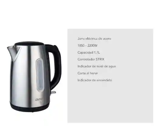 Elegante Jarra eléctrica de acero 1850-2200W, con capacidad 1,7L, controlador STRIX, Indicador de nivel de agua, con función de corte al hervir, indicador de encendido.