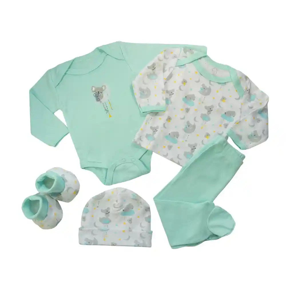Pumucki trae para tu bebé... Delicado, novedoso y útil ajuar para abrigar al bebe e ideal para regalo baby shower! Contiene: Body bordado, camiseta estampada, botines estampados, gorro estampado y panty lisa. Motivo: Koala Tela 100% algodón hipoalergénico Puedes ser usado en bebés de 0- 6 meses de edad. Incluye Caja de Regalo Instrucciones de cuidado: -Lavar a maquina con agua tibia -Lavar a maquina en ciclo delicado -Usar blanqueador sin cloro cuando sea necesario -Secar a maquina con temperatura baja -Planchar con plancha fría si es necesario