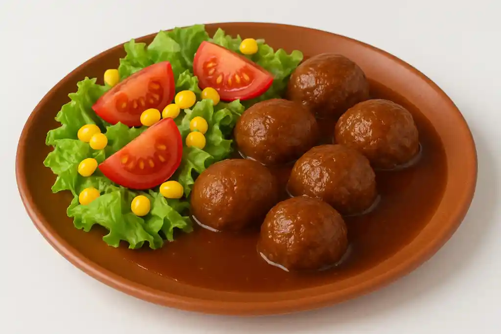 Albóndigas caseras en salsa de carne acompañado de ensalada surtida. Consulte por otros acompañamientos.