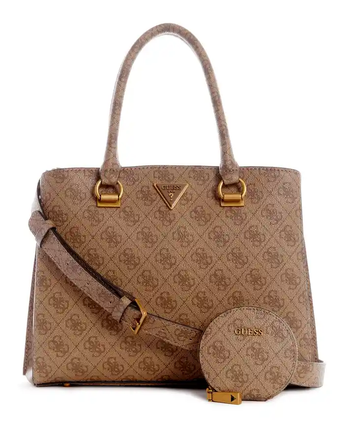 Modelo: BB841606. Cartera con doble asa acolchada y asa ajustable al hombro. Diseño en tono liso con estampado 4G y logotipo triangular Guess en parte frontal. Con broche magnetico y bolsillos internos con cierre de cremallera y monedero adosado al asa. Materiales: 20% COTTON + 80% POLYESTER.