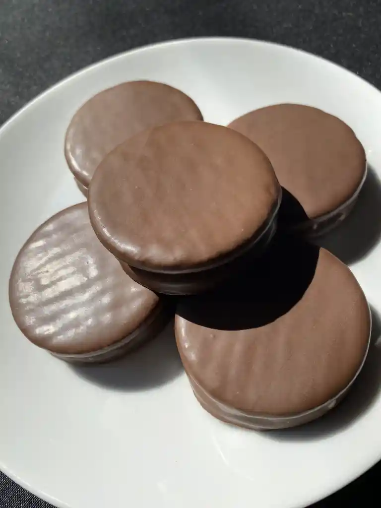 Alfajor de chocolate tradicional, relleno con manjar y un toque de brandy, bañado en chocolate semiamargo. Puede o no tener decoracion de chocolate blanco.