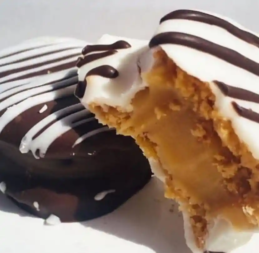 Alfajores de avena rellenos con manjar blanco natural sin gluten, bañados en chocolate negro, blanco y sin baño.