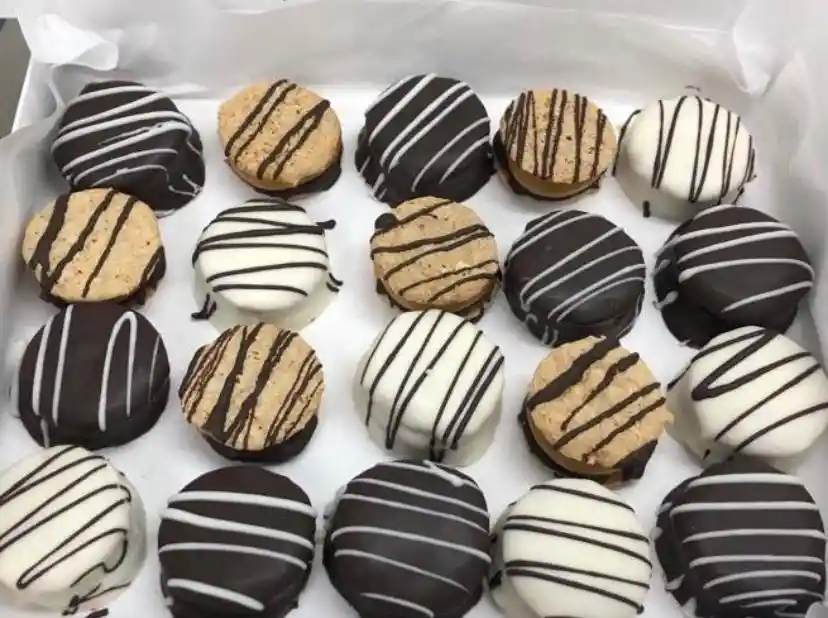Alfajores de avena rellenos con manjar blanco natural sin gluten, bañados en chocolate negro, blanco y sin baño.