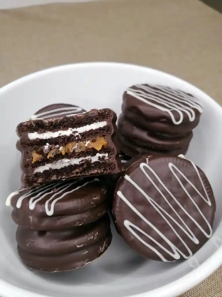 Dos suaves galletaS Oreo, rellenas con dulce de leche y bañadas en chocolate. Una combinación perfecta entre lo clásico y lo irresistible, con el toque crujiente y cremoso que todos aman.