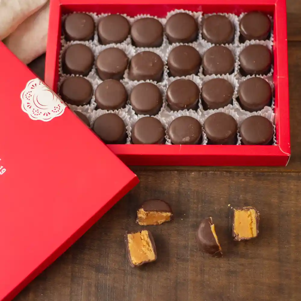 Alfajor de mazapán San Estanislao, relleno de manjar blanco artesanal y bañado en chocolate bitter. Cantidad: 20 unidades Conservación: Mantener sellado en un lugar fresco y seco , entre 10-18 °C, 65% humedad. Duración: 10 días.