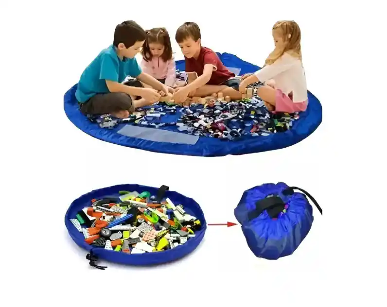 Súper práctica bolsa para guardar juguetes. Ahora puedes mantener sus juguetes bien organizados y ordenados en un lugar seguro. La bolsa te ayuda a evitar el desorden de juguetes en todas partes manteniéndolos en una bolsa de acceso rápido. Ahorrarás tiempo y te evitarás las molestias de la limpieza de los juguetes de la habitación. Lona resistente y material de nailon: hecha de lona de calidad superior y cordón de nailon, es muy duradera, resistente, ligera y capaz de almacenar hasta juguetes de plástico duro, como piezas de Lego, Playmobil, Mega Bloks, Lincoln Logs, coches, muñecas, trenes, etc. Alfombra para juguetes extremadamente versátil: no solo es una bolsa de almacenamiento, se puede ampliar hasta 150 cm de diámetro, por lo que los niños pueden jugar en ella.