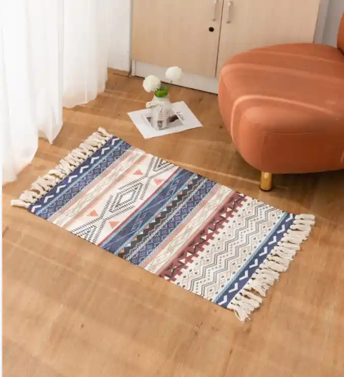 Alfombra de Estilo Étnico para dormitorio o sala de estar. Material: Lino con Algodón Medida: 1mts x60 cm con flecos Antideslizante con flecos